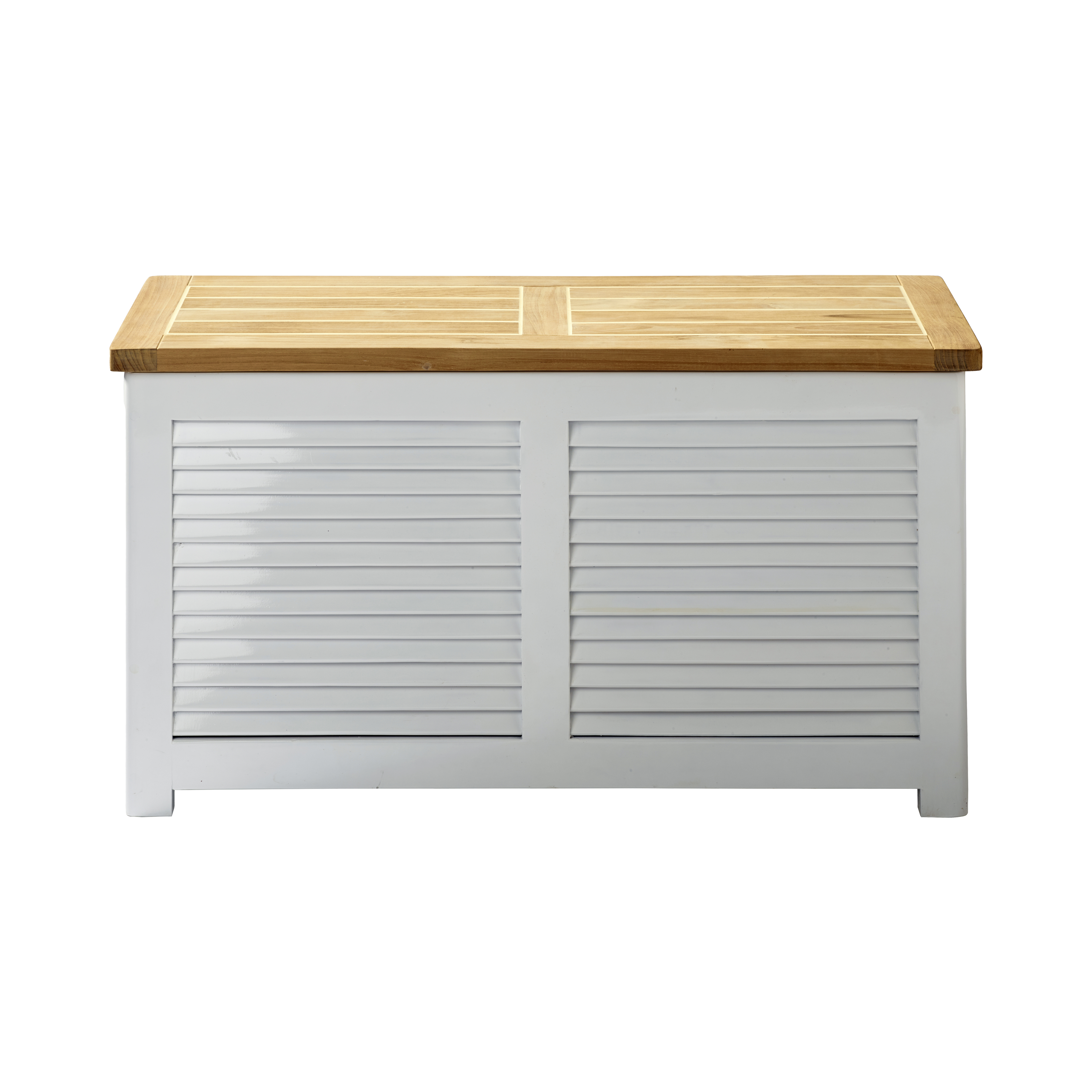 The combination of white-painted mahogany and the warm teak lid gives the bench a bright, calm and timeless expression that fits beautifully into both modern and classic homes.