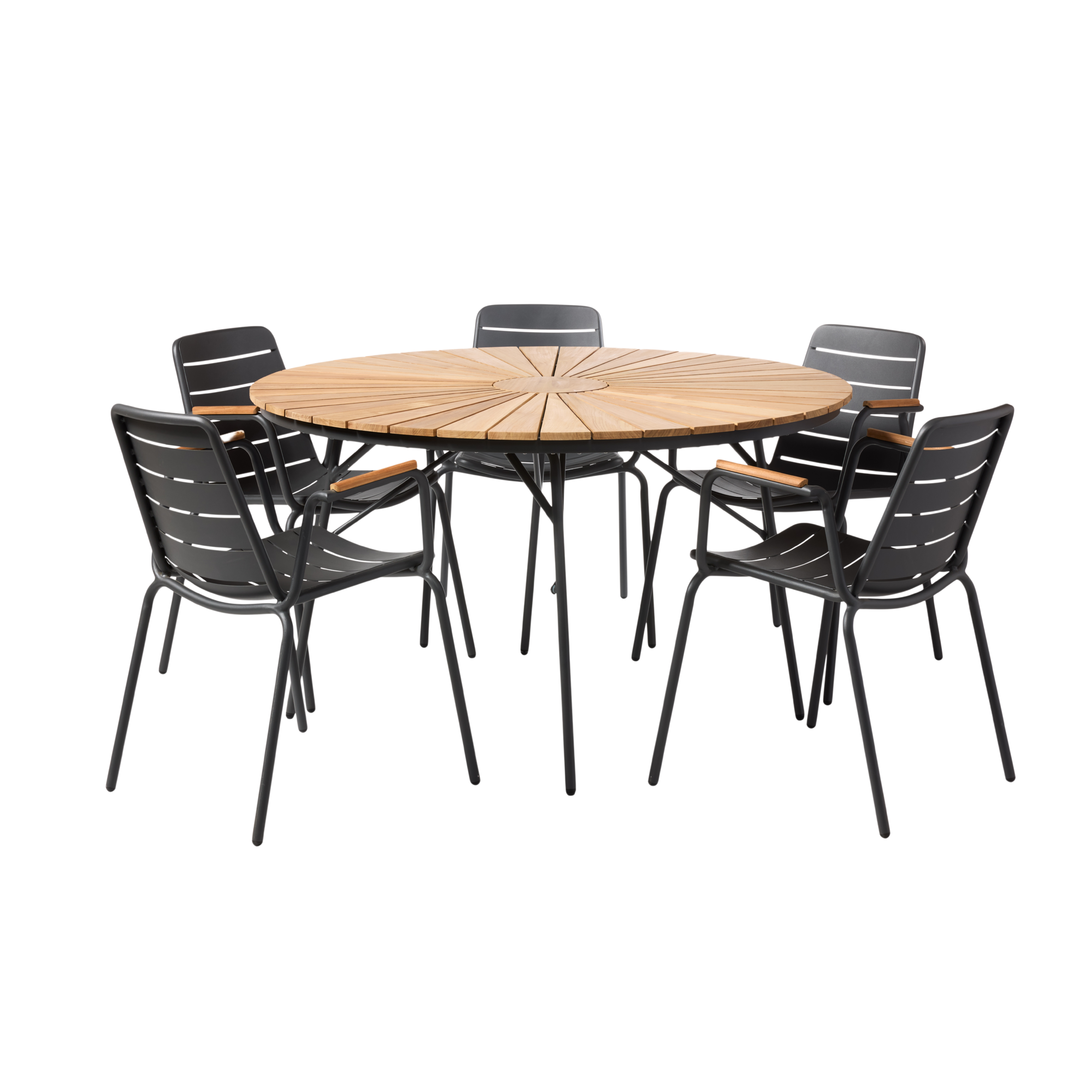 The five Parc chairs add a light and graphic design language to the set. The slim, powder-coated aluminium and the horizontal lines of the seat and back emphasise the functional expression, while the teak details on the armrests create a subtle connection to the wooden surface of the table.