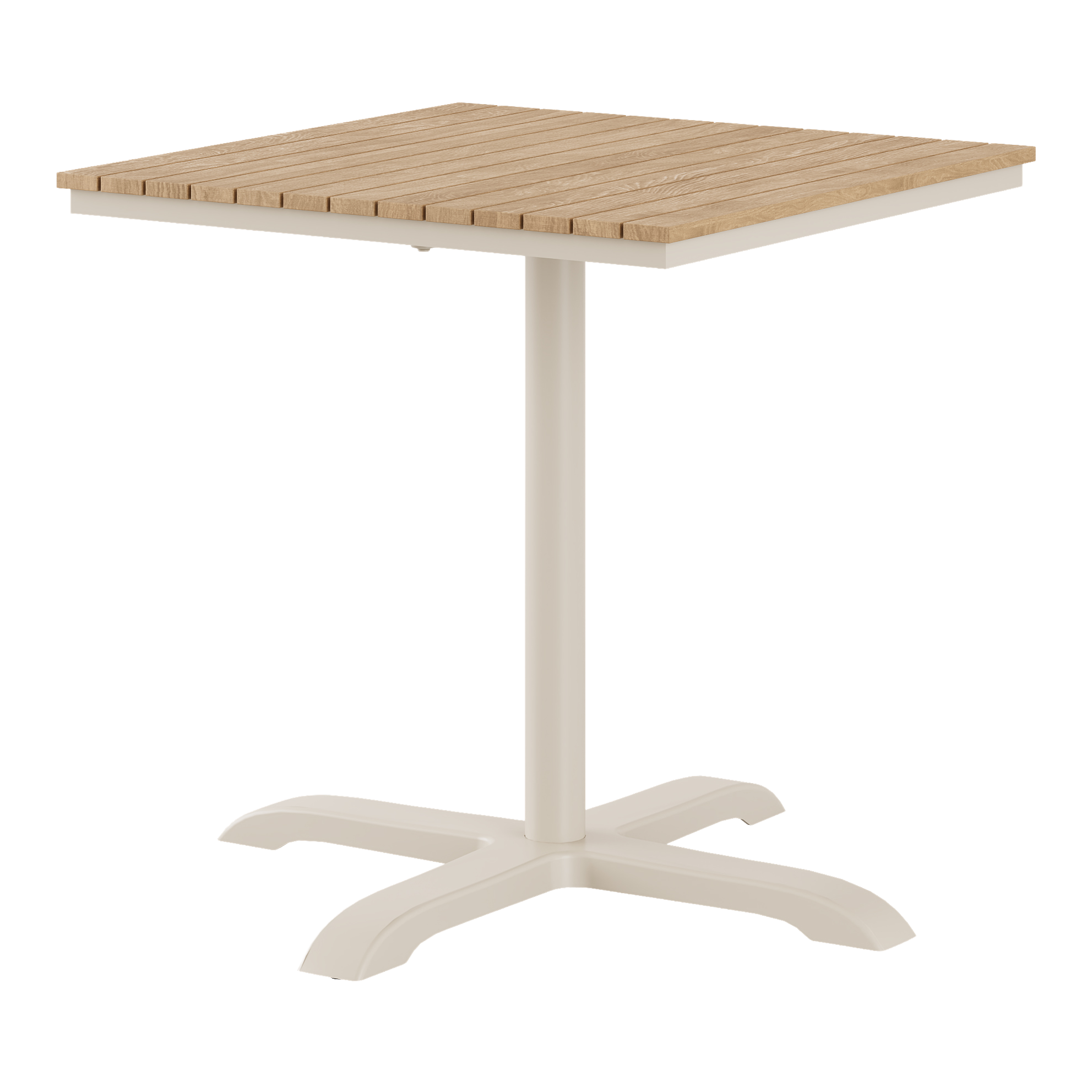 A neat and compact café table in sand-coloured aluminium with a teak tabletop – perfect for balconies, small gardens or as an extra table when flexibility is needed.