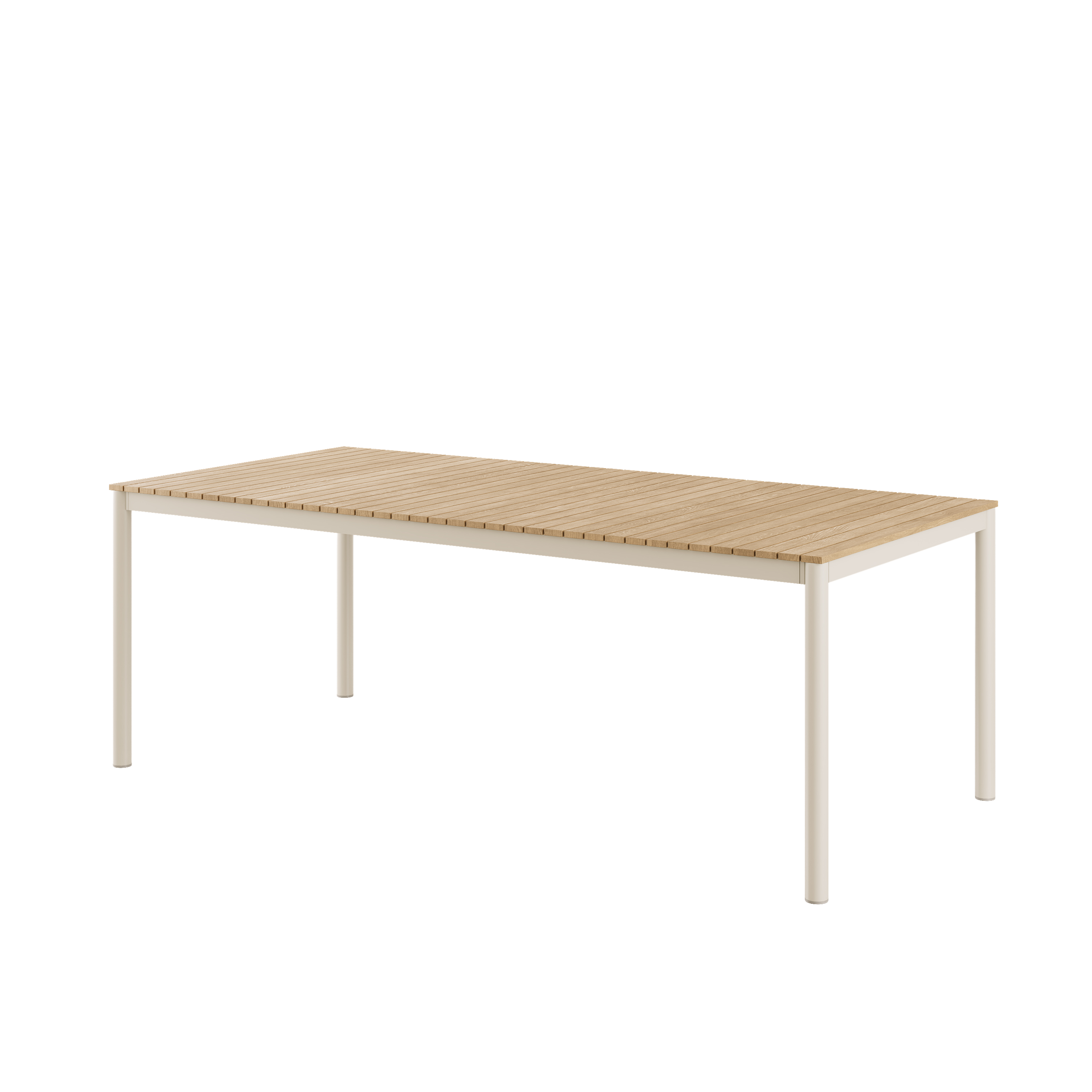 An elegant and clean-lined dining table in sand-coloured aluminium with a teak tabletop – designed for outdoor spaces where Nordic calm, clean lines and a timeless design language take centre stage. The table comfortably seats six and can easily accommodate up to eight.