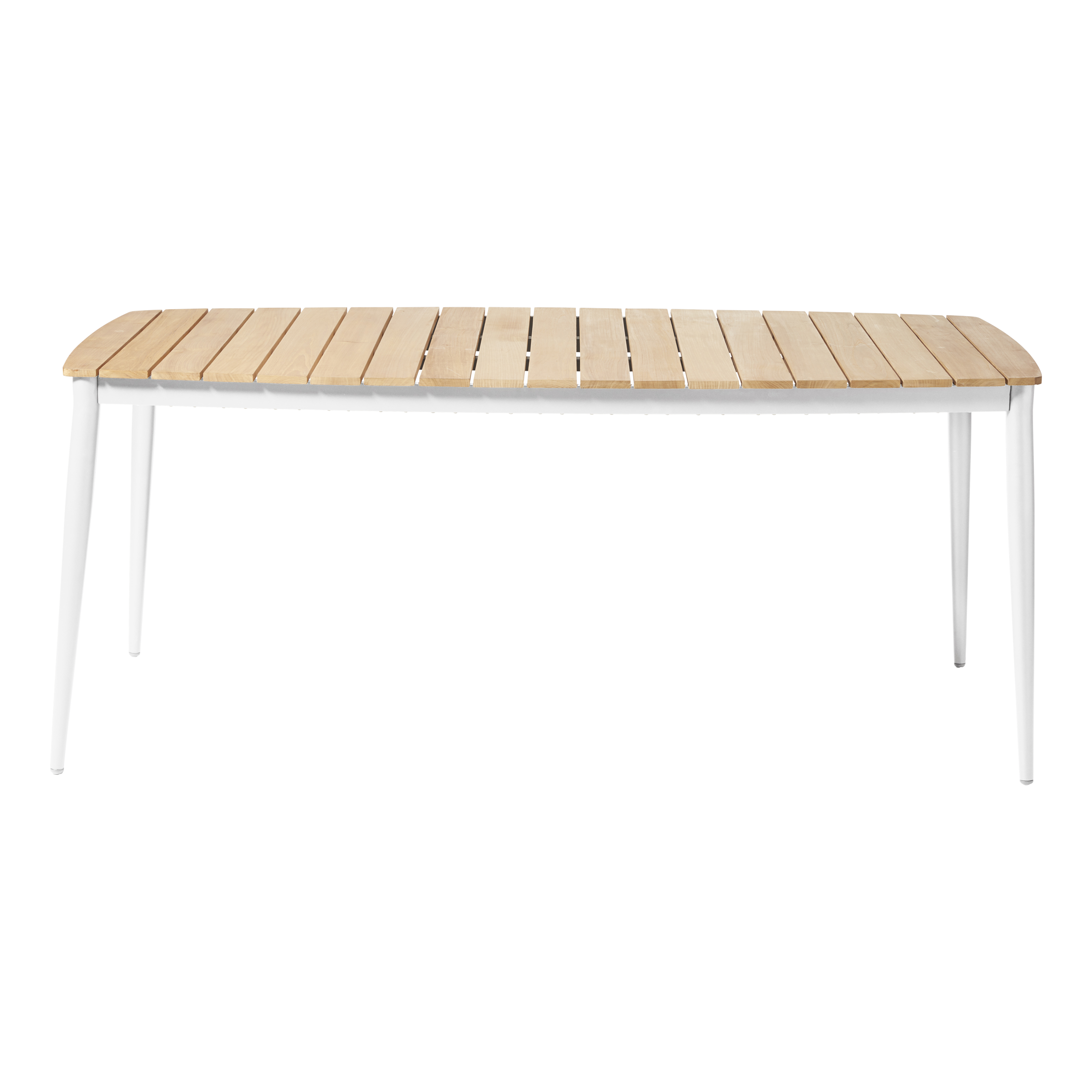 An elegant outdoor table that combines white powder-coated aluminium with a tabletop made of warm teak slats.