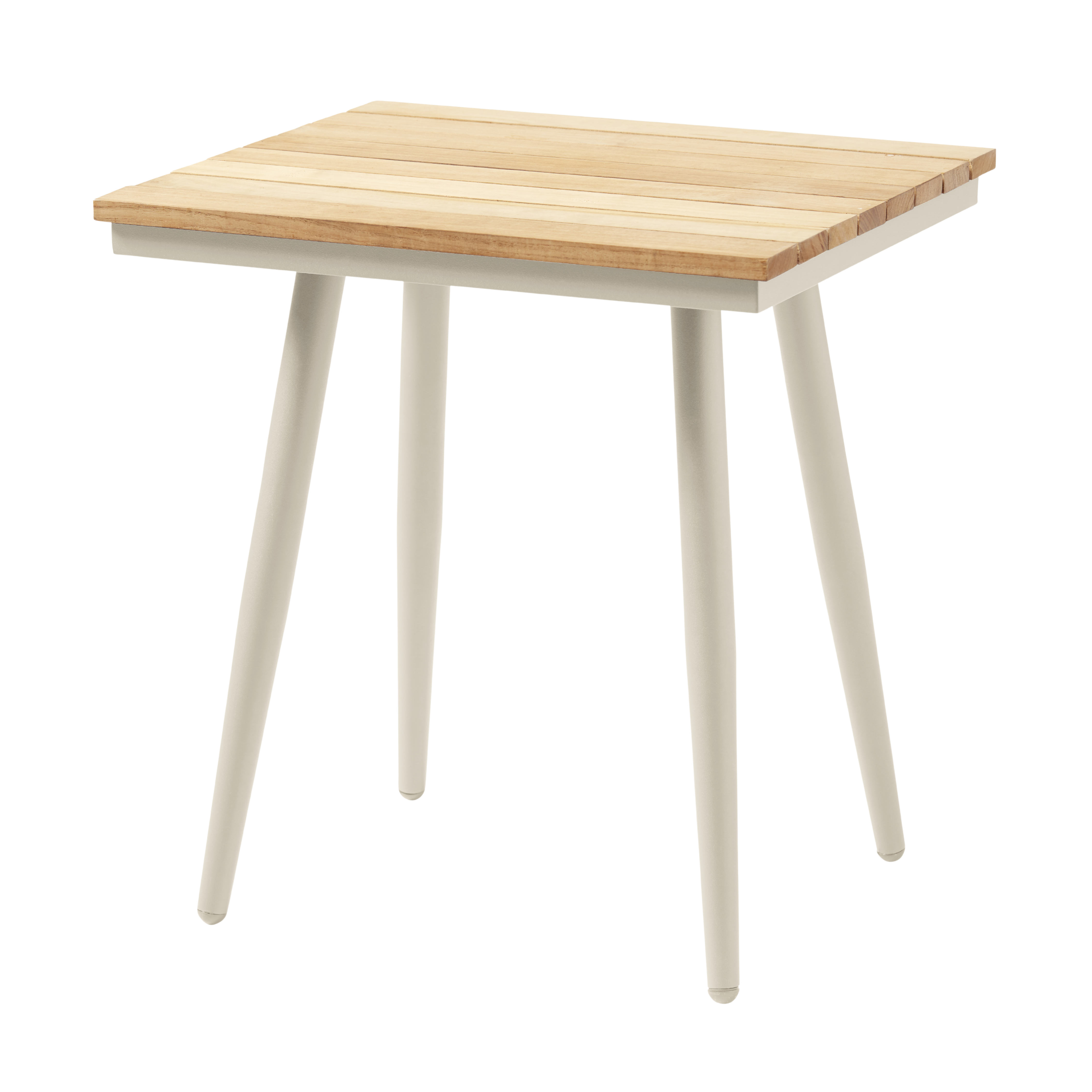 A sleek side table in sand-coloured aluminium with a tabletop made of teak slats. A timeless design that brings calm and charm to any lounge area.