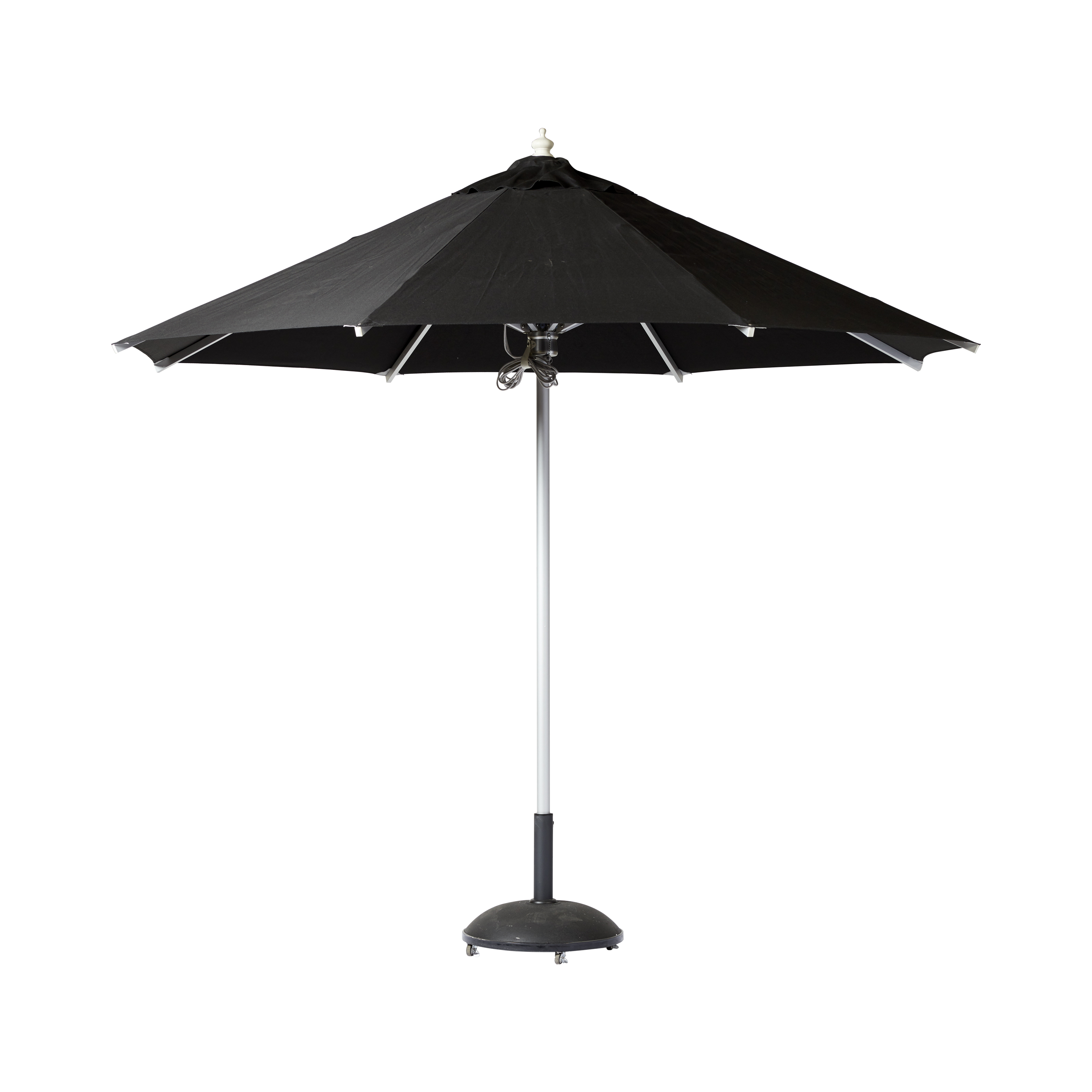 A round parasol in black, sewn in colourfast olefin and measuring 330 centimetres in diameter – created to provide shade on the terrace, in the garden or over the outdoor dining area.