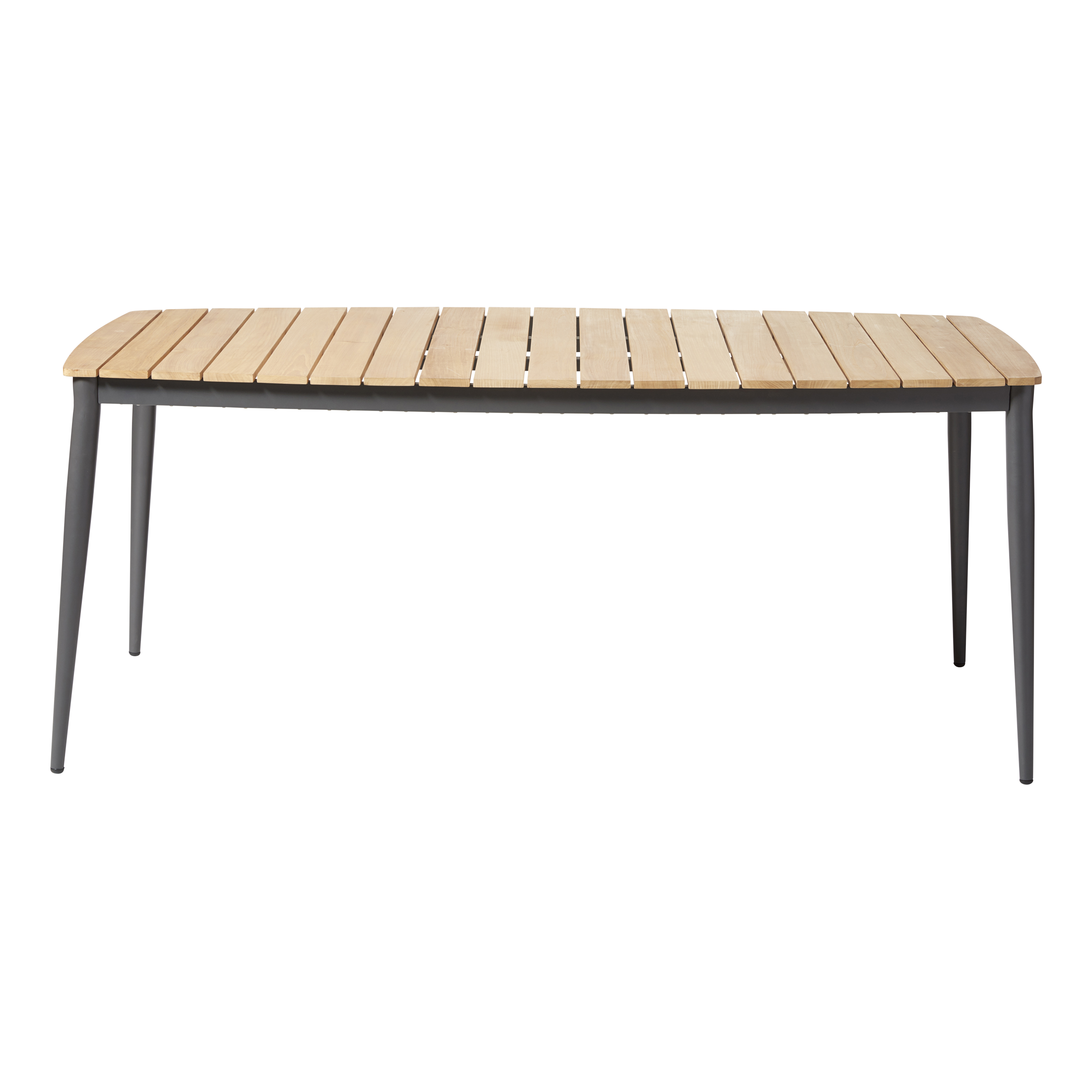 An elegant outdoor table that blends powder-coated aluminium in anthracite with a tabletop made of warm teak slats.