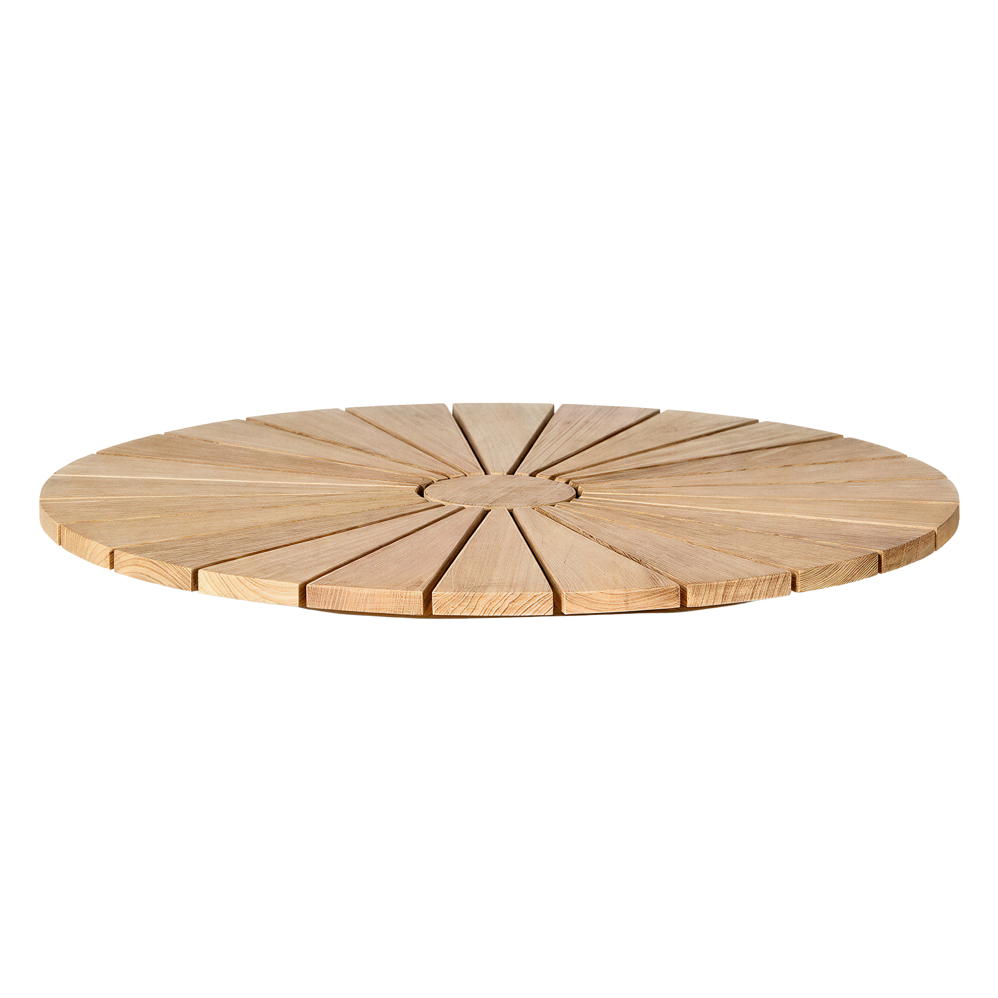The Lazy Susan is crafted from solid teak and follows the Ellen table’s distinctive design language, featuring the beautiful radial plank pattern where the wood’s natural grain and warm tones are clearly visible. This creates a harmonious and cohesive look that blends naturally with the table’s design.