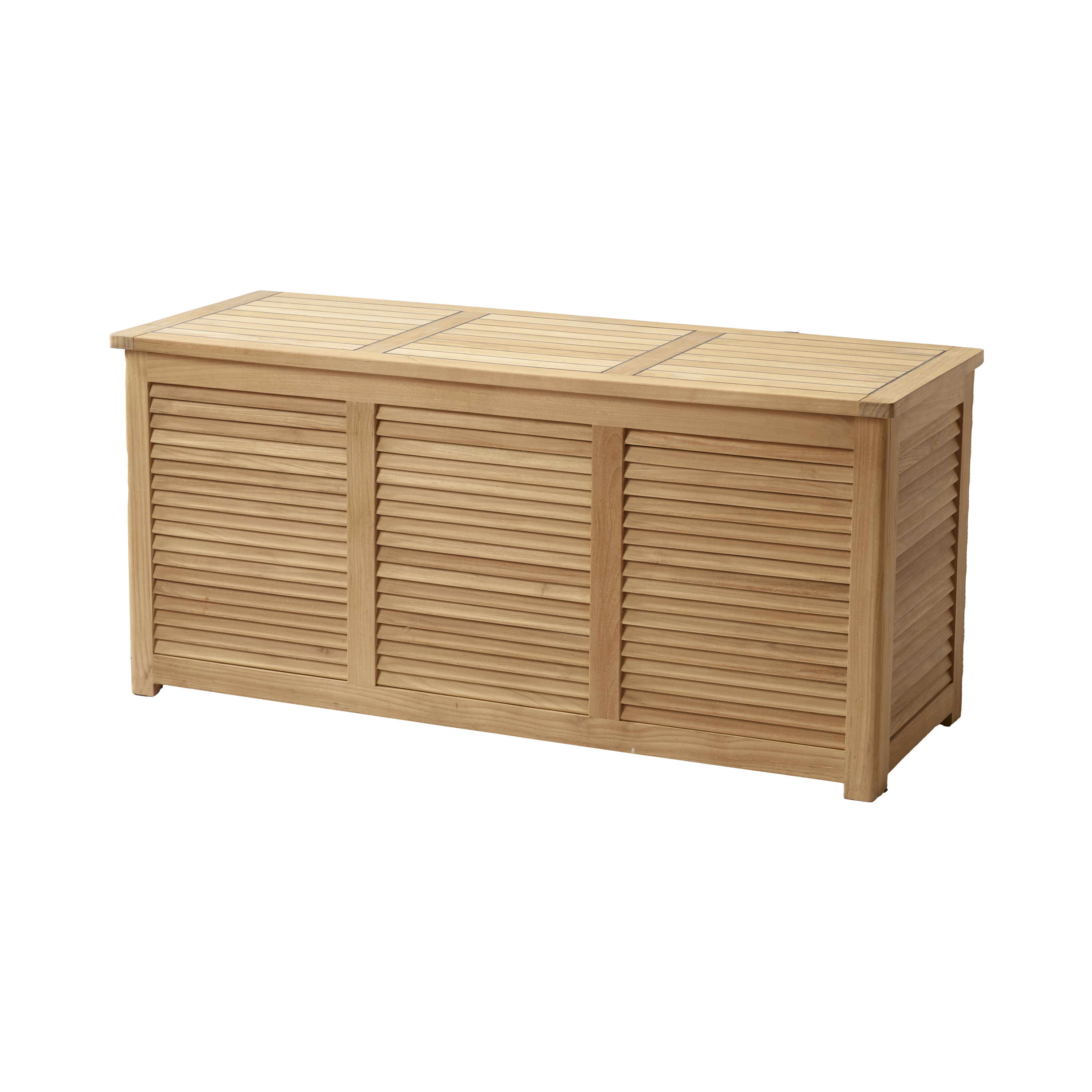 A spacious cushion box in solid teak with natural ventilation and a flat lid, allowing it to function as both storage and extra seating – perfect indoors and outdoors when kept under cover.