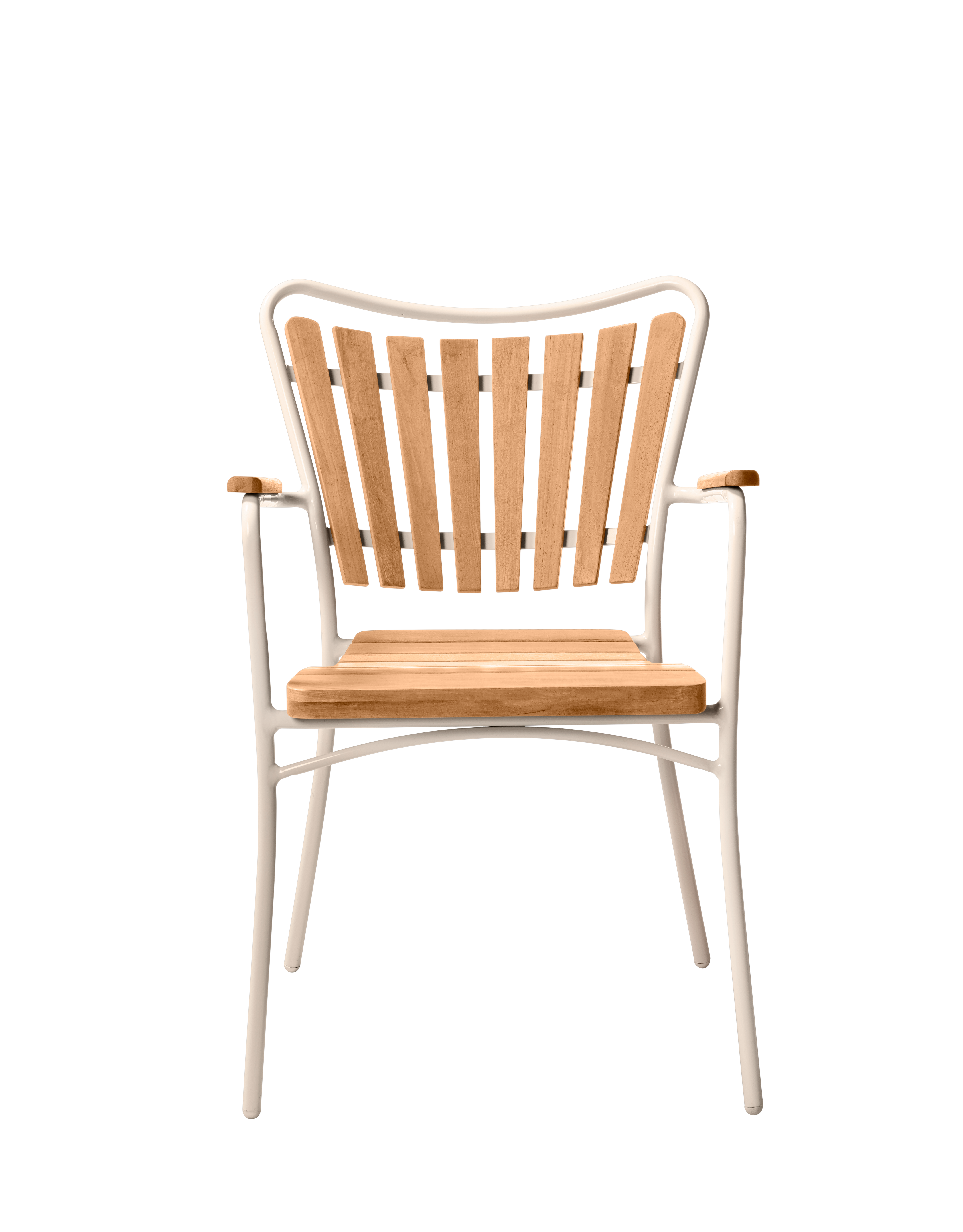 Made from warm teak slats and powder-coated aluminium, it combines durability with elegant simplicity. When not in use, the chair can easily be stacked.