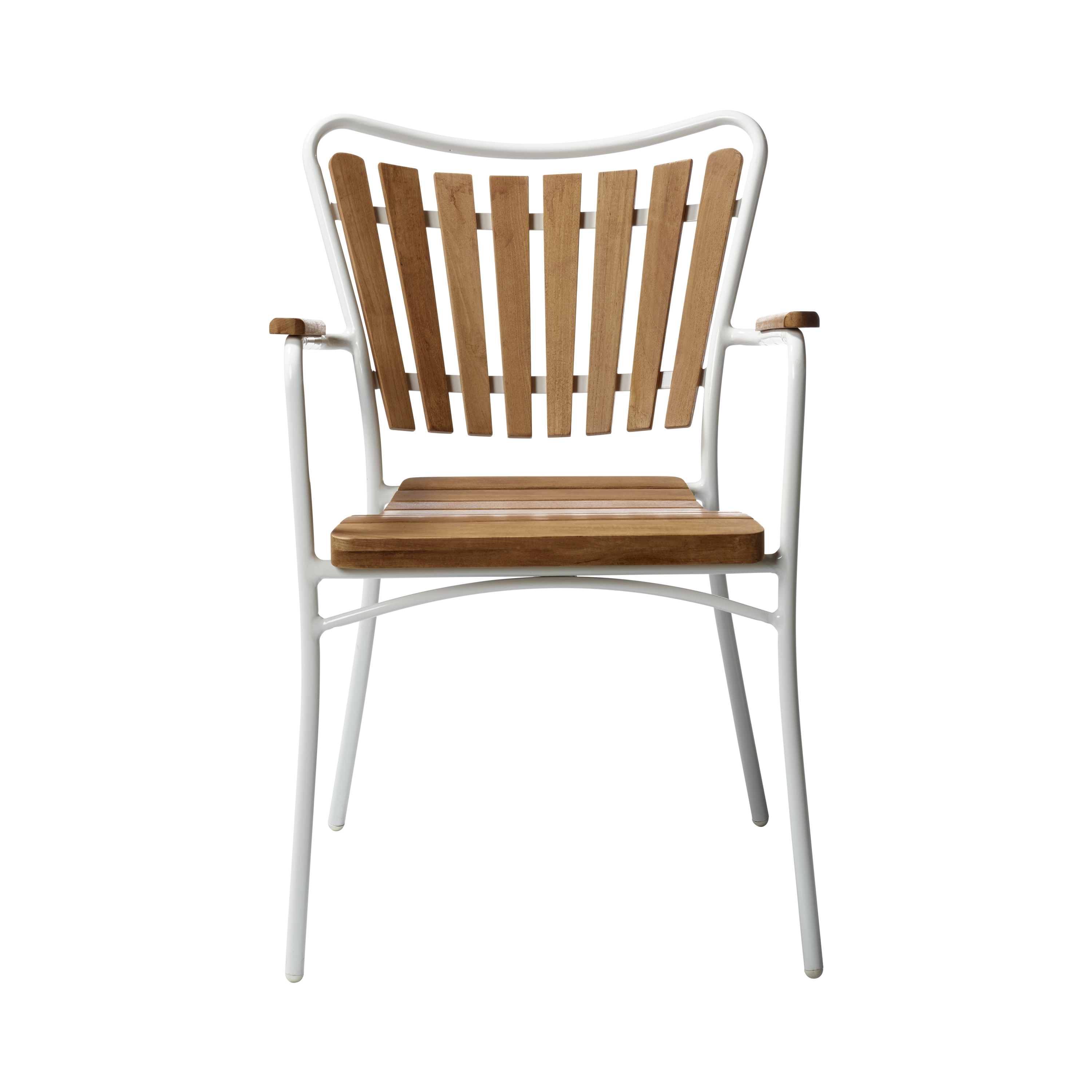 Made from warm teak slats and powder-coated aluminium, it combines durability with elegant simplicity. When not in use, the chair can easily be stacked.