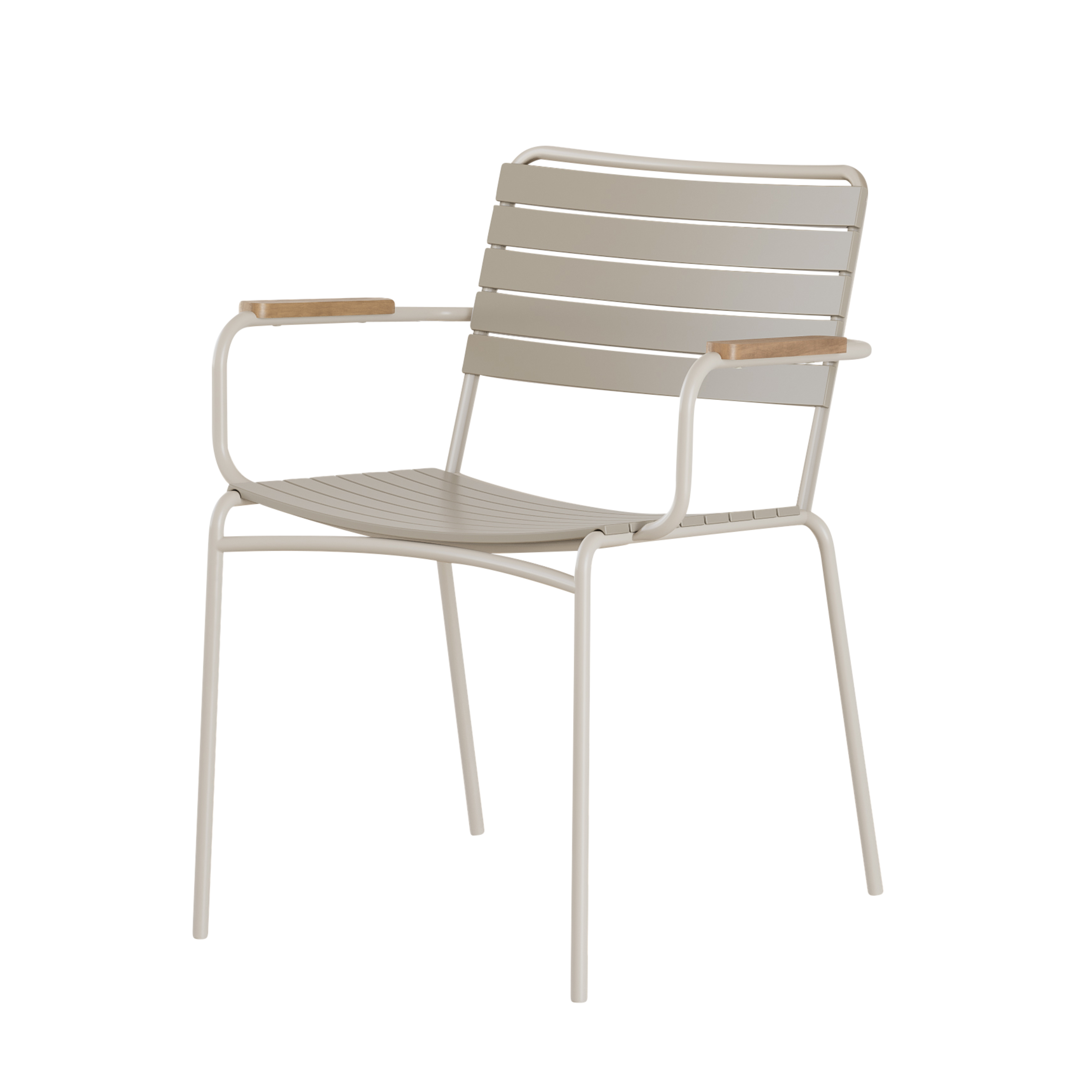 The sand-coloured aluminium frame combined with teak armrests and sand-coloured, weather-resistant PP slats gives the chair a calm, bright, Nordic and modern expression.