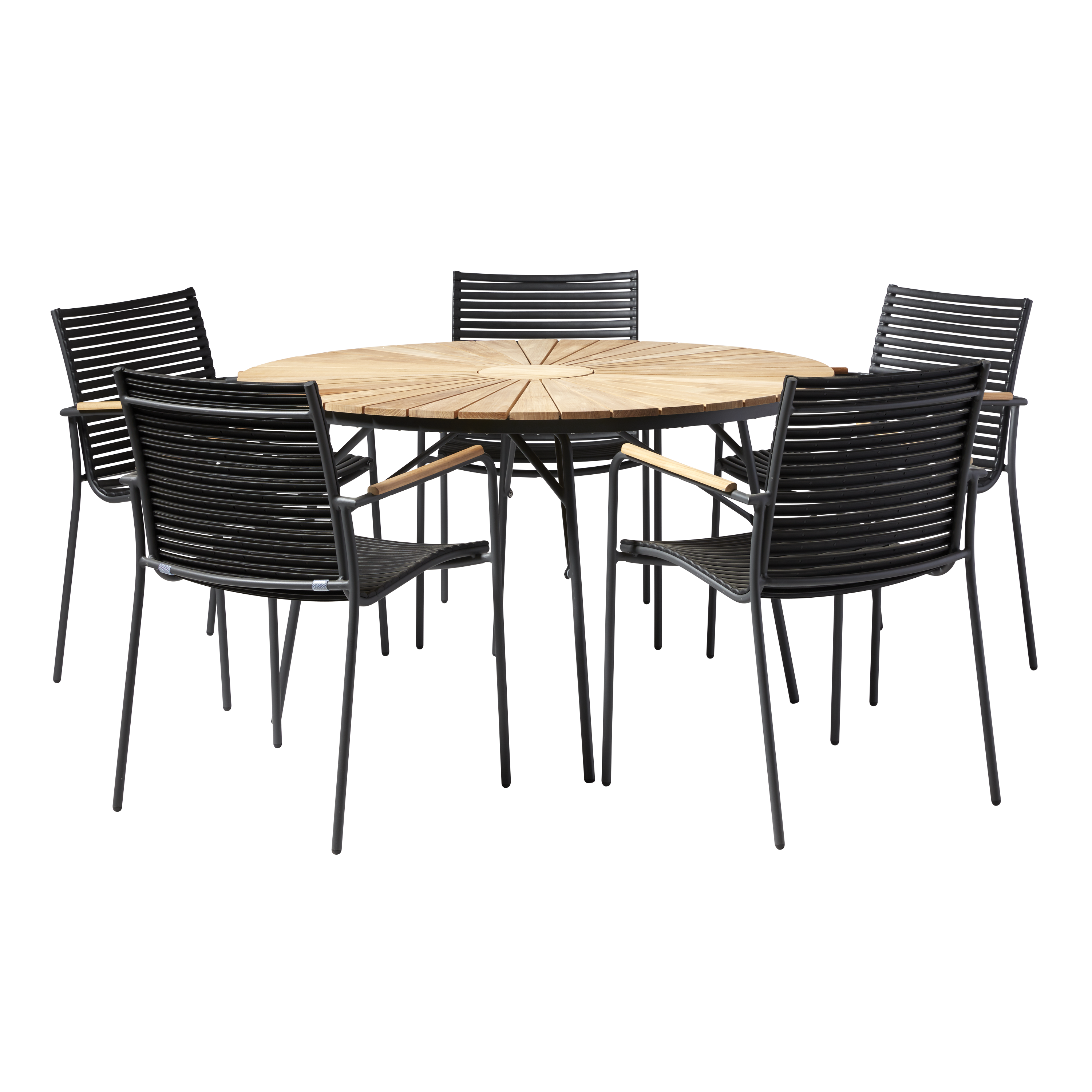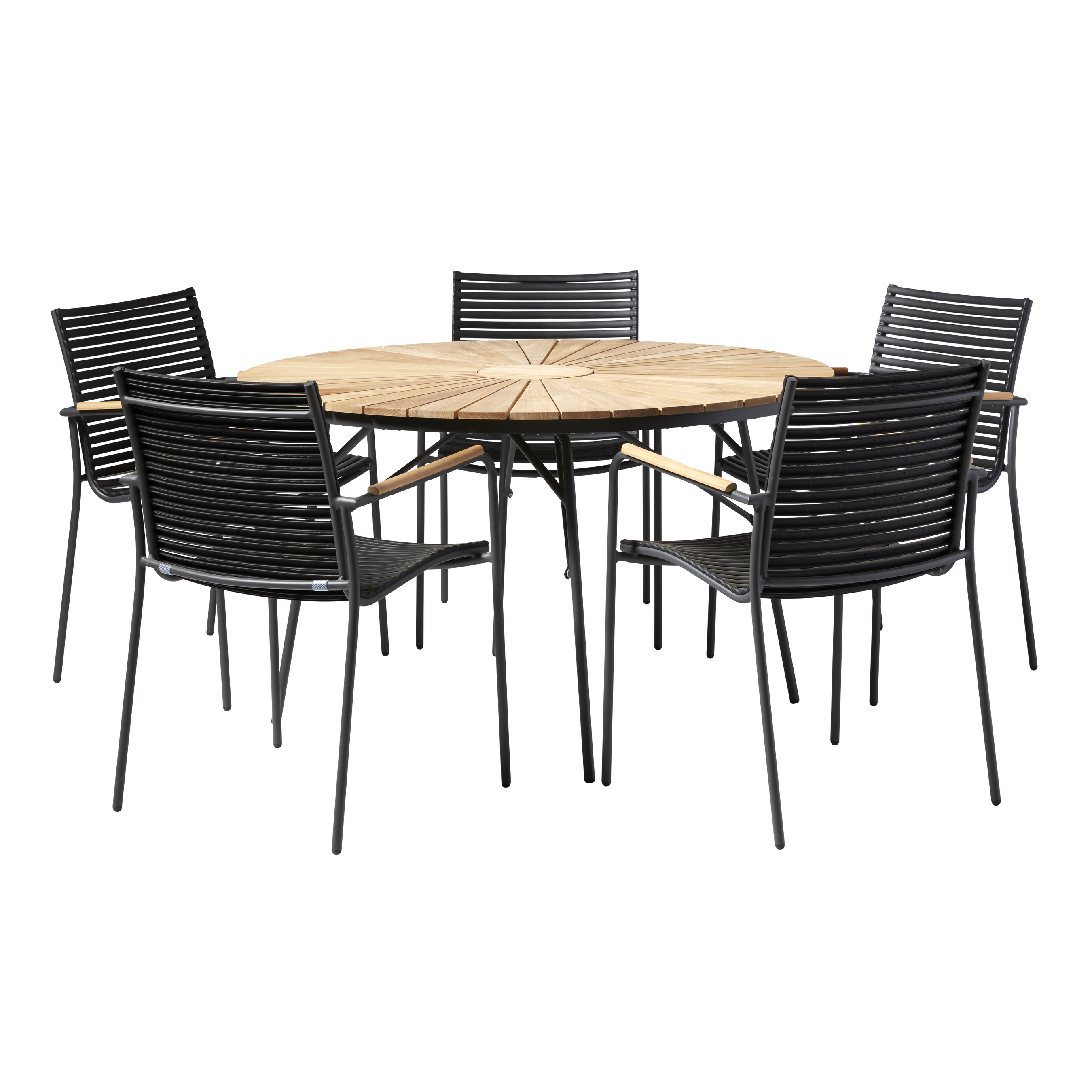 The warm teak slats contrast beautifully with the anthracite-coloured aluminium frame, and the black slats of the chairs emphasise the graphic expression. The combination of teak and aluminium creates a modern and harmonious whole that fits naturally on the terrace, in the garden or at the summer house.