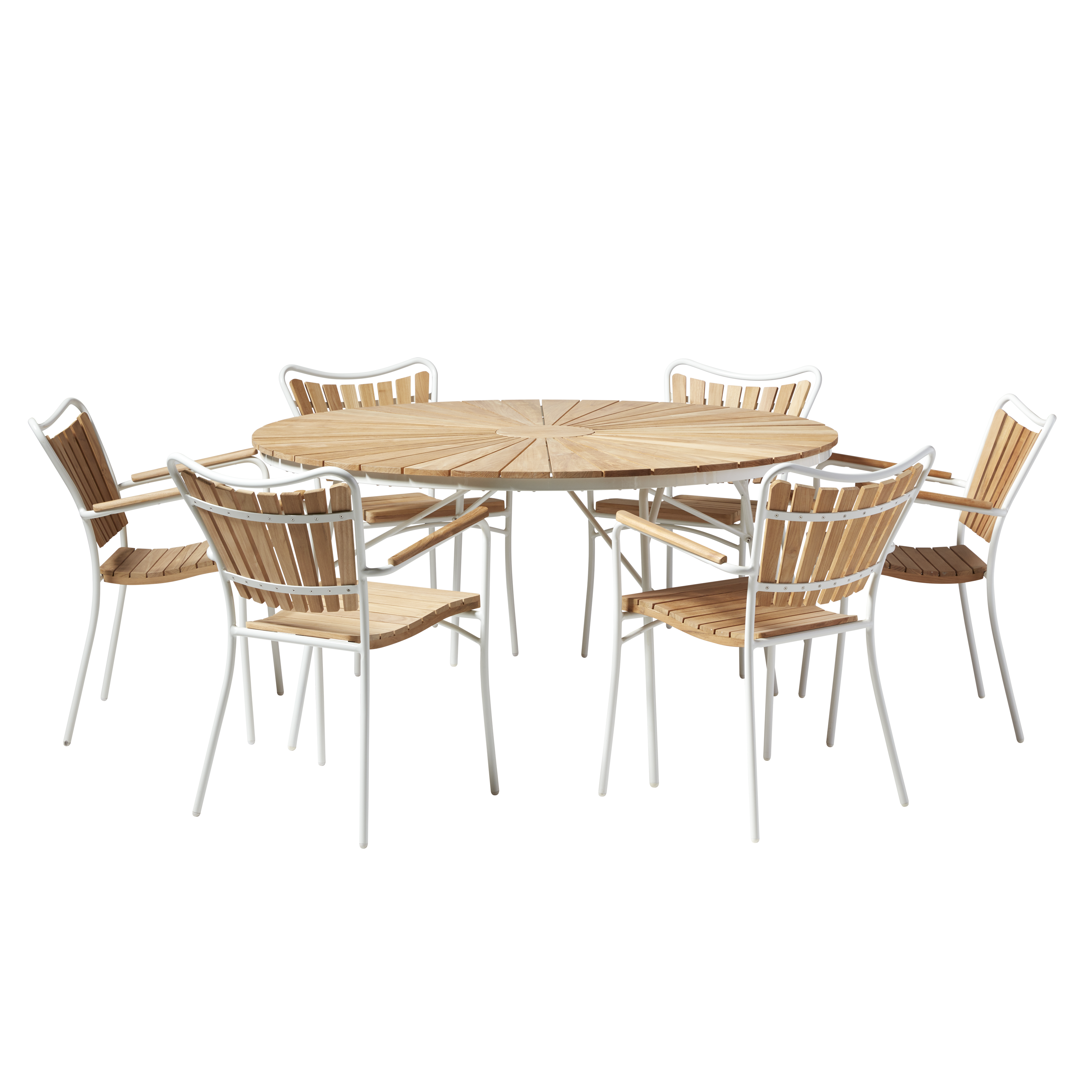 A generous Ellen garden set with a round table measuring 150 centimetres in diameter and six chairs in teak and a white frame – created for spacious outdoor settings, long summer evenings, and room for both everyday life and guests.