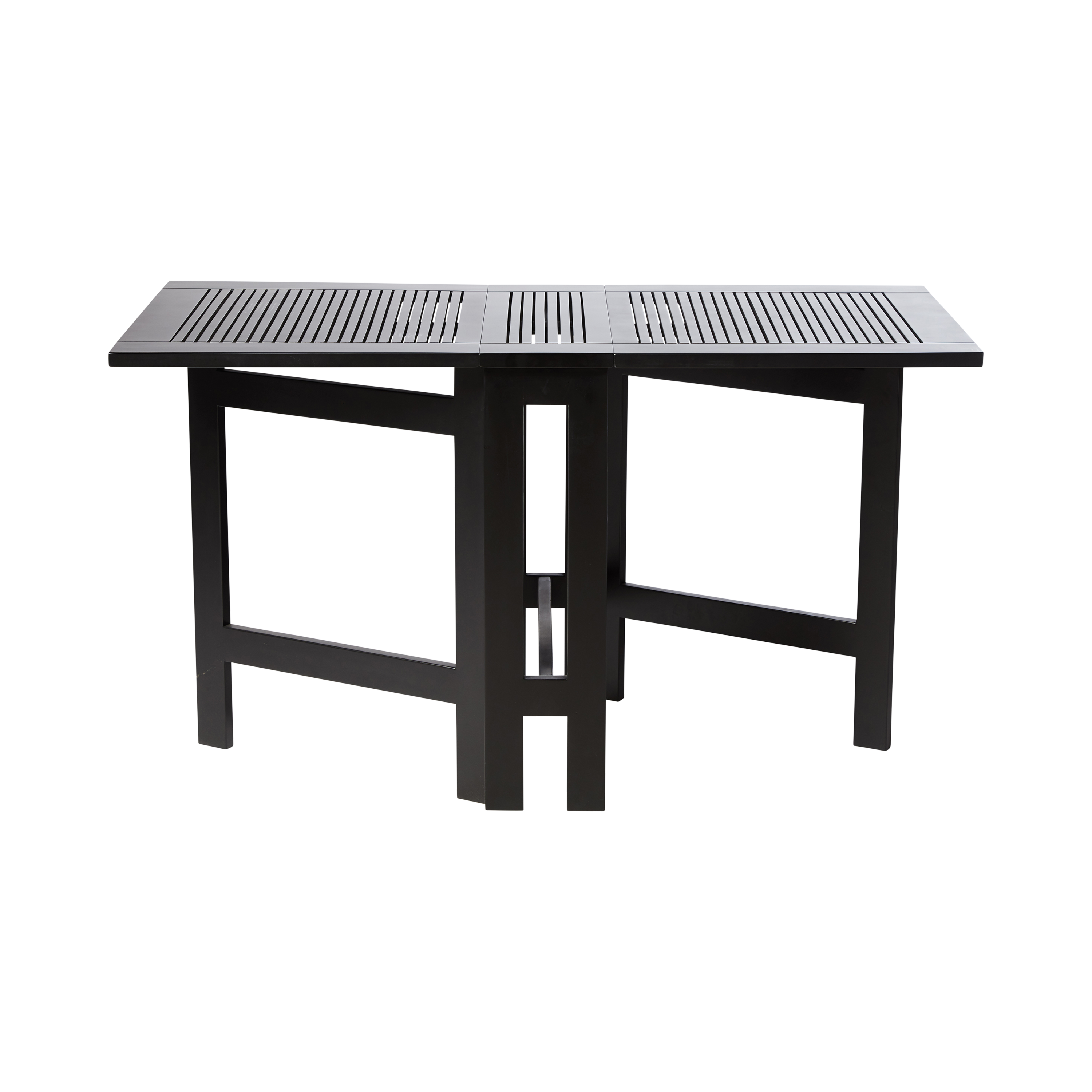 An elegant and flexible rectangular folding table in black-painted mahogany — created for outdoor spaces with varying needs, where the table can take up little space, a bit more, or a lot.