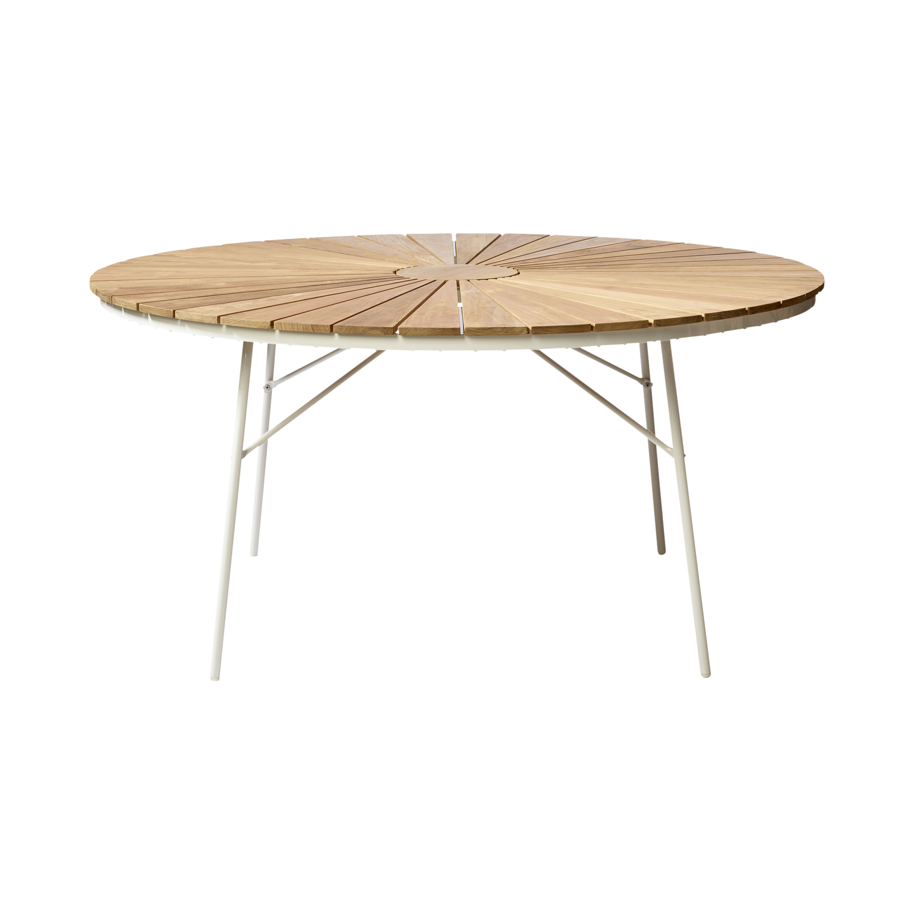 Here shown in 150 centimetres in diameter – with a white frame and room for six people. A size that requires a little more space than the smaller table models in the Ellen series.