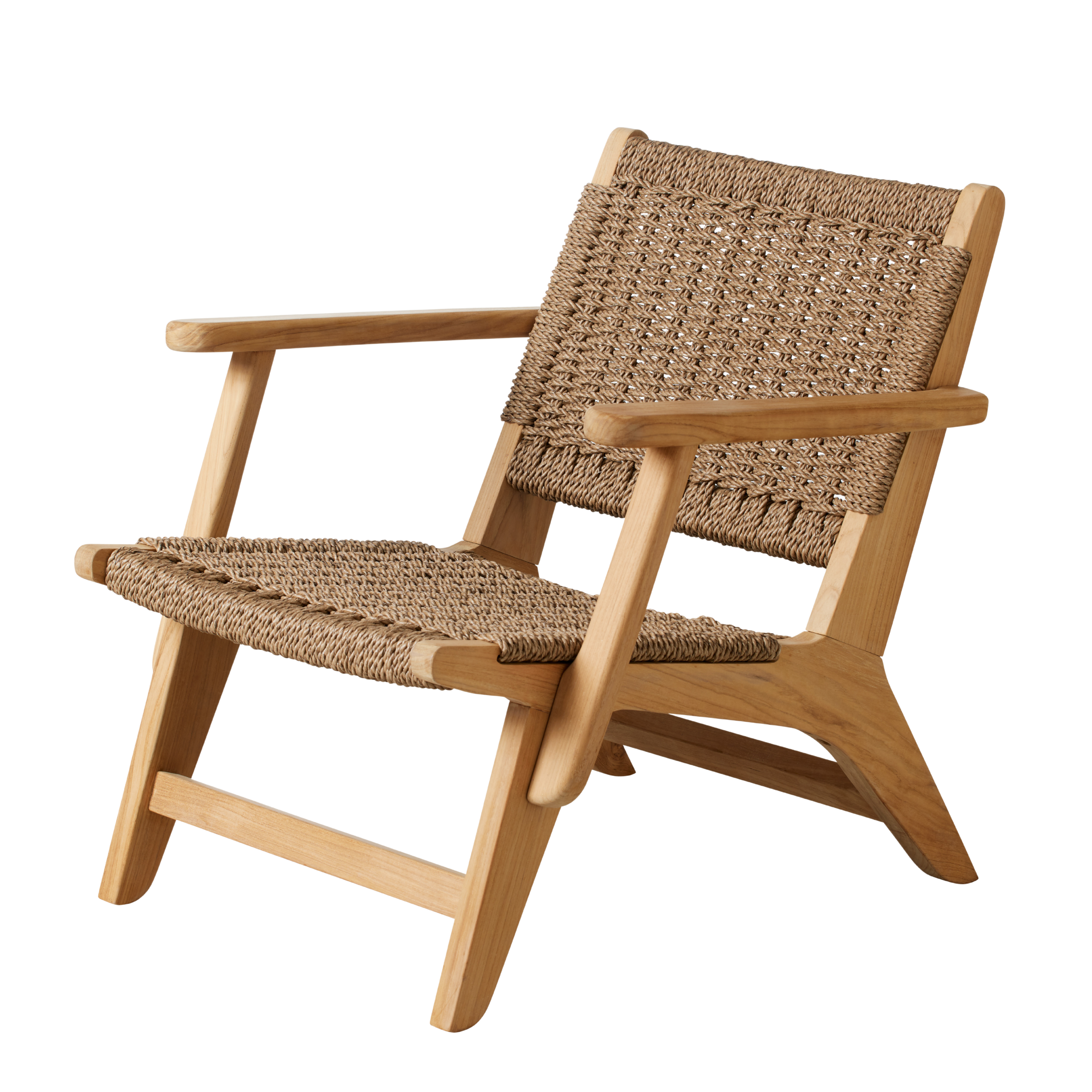 An inviting outdoor lounge chair in teak and weather-resistant Viro rope, designed for leaning back and enjoying life outdoors.