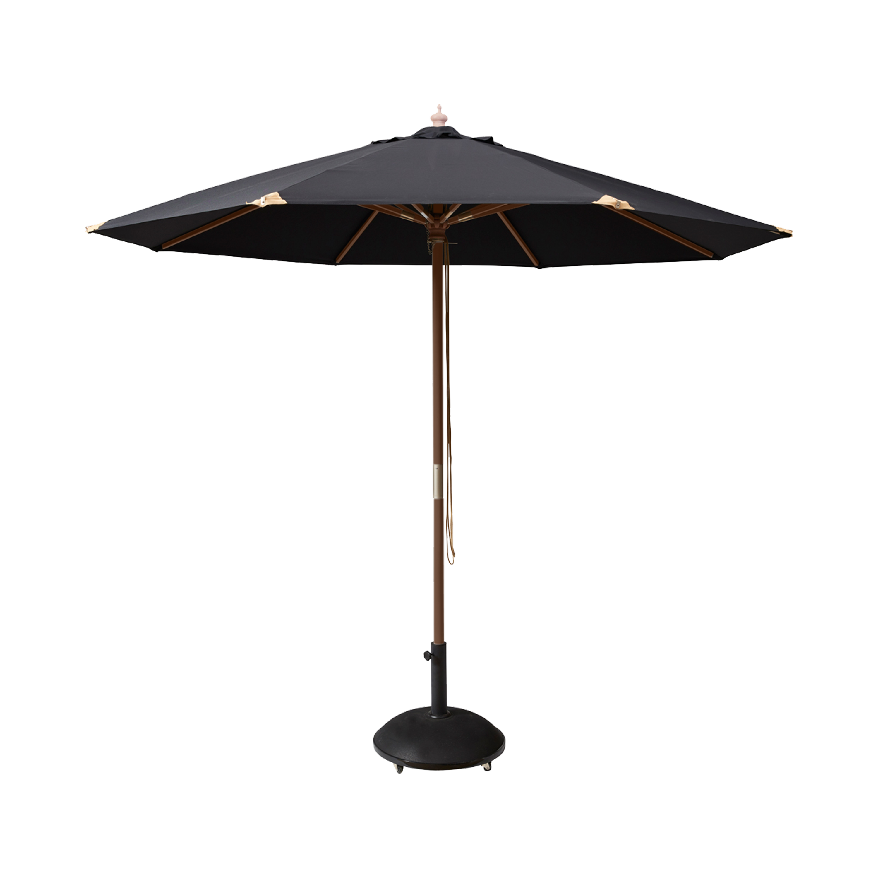 The solid wooden centre pole with a teak-coloured finish adds warmth and contrast to the dark canopy, while the two-piece construction makes the parasol easy to handle and store.