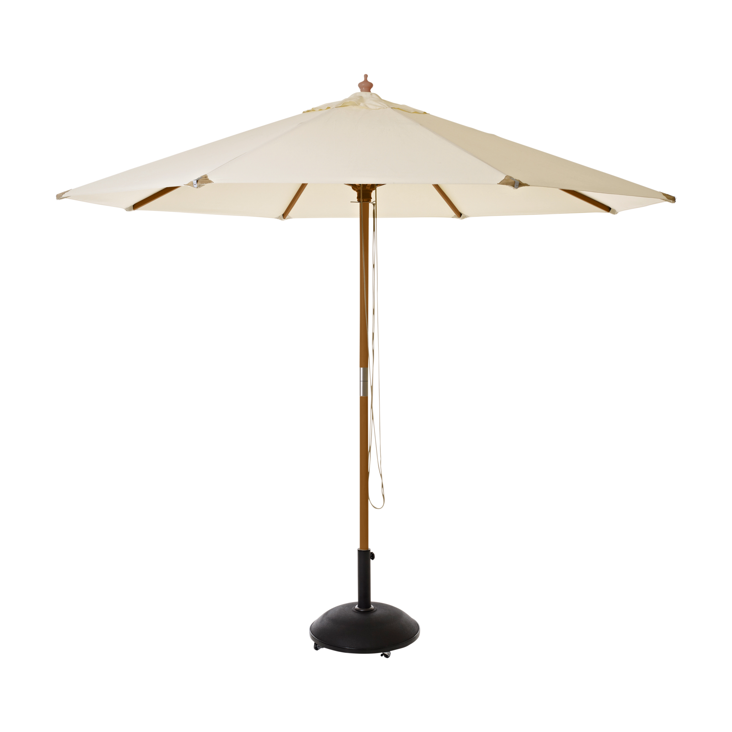 The solid wooden centre pole with a teak-coloured finish adds warmth and natural character, while the two-piece construction makes the parasol easy to handle and store.