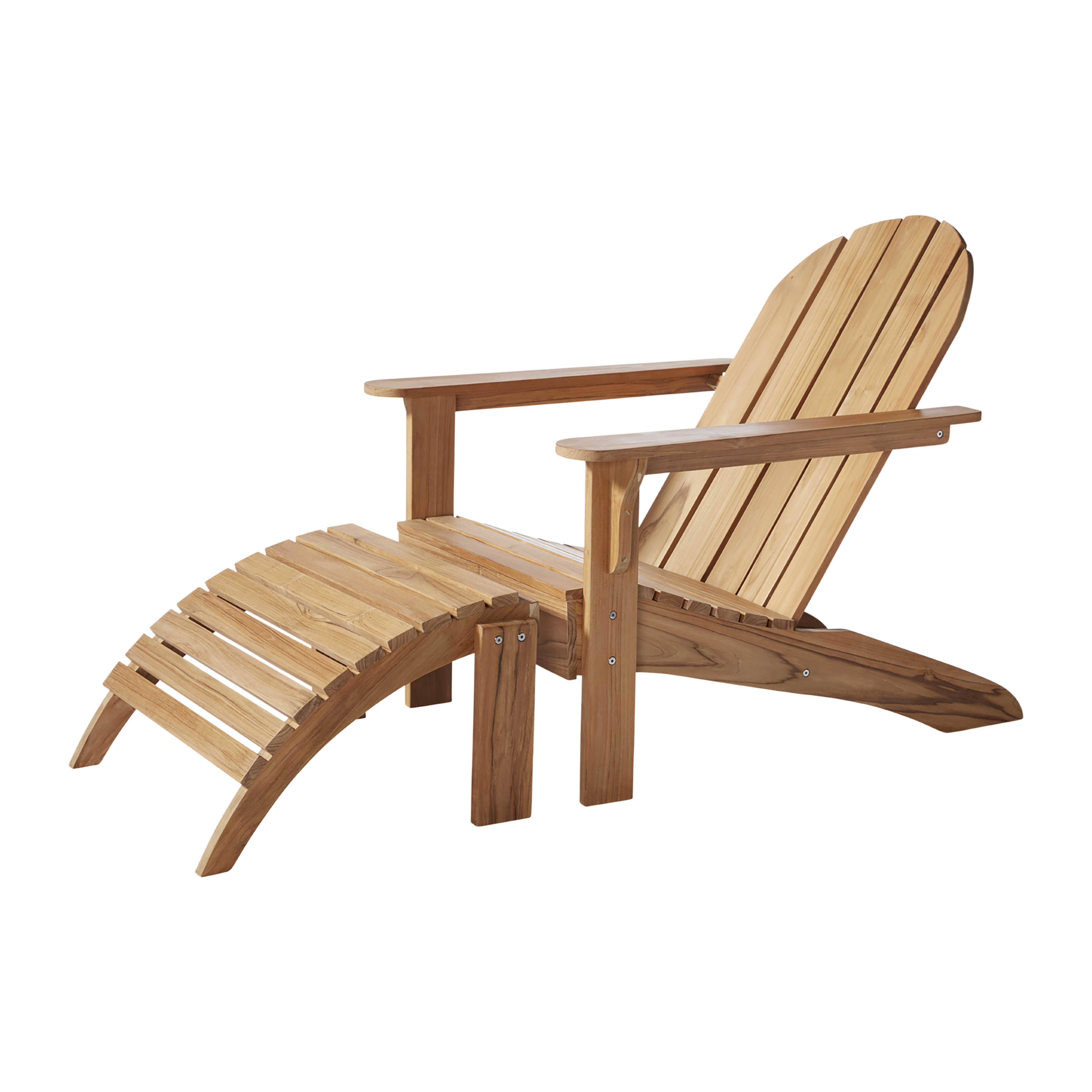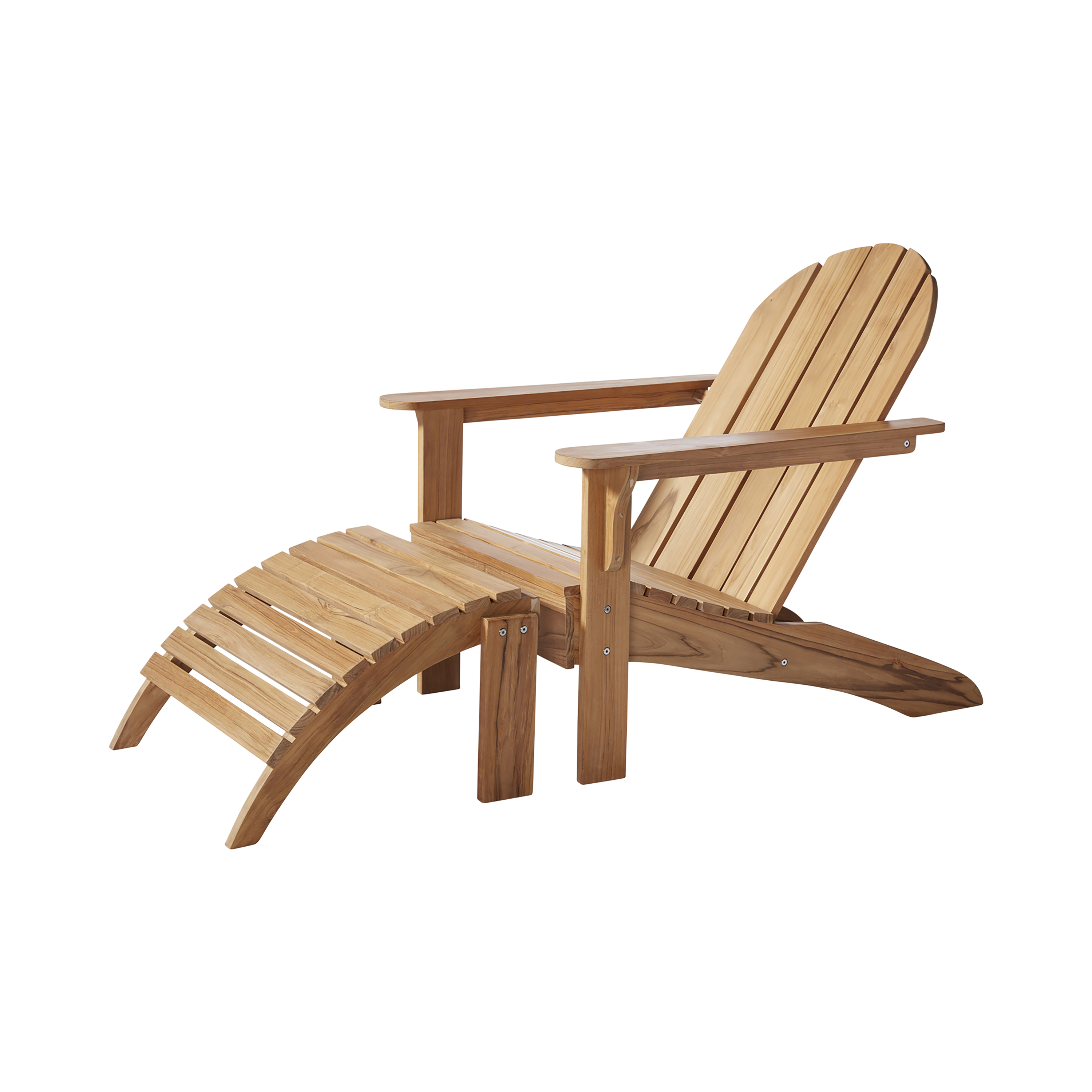 The Adirondack chair and footstool together form an outdoor resting place in teak – created for calm, comfort, and quality living in the open air.