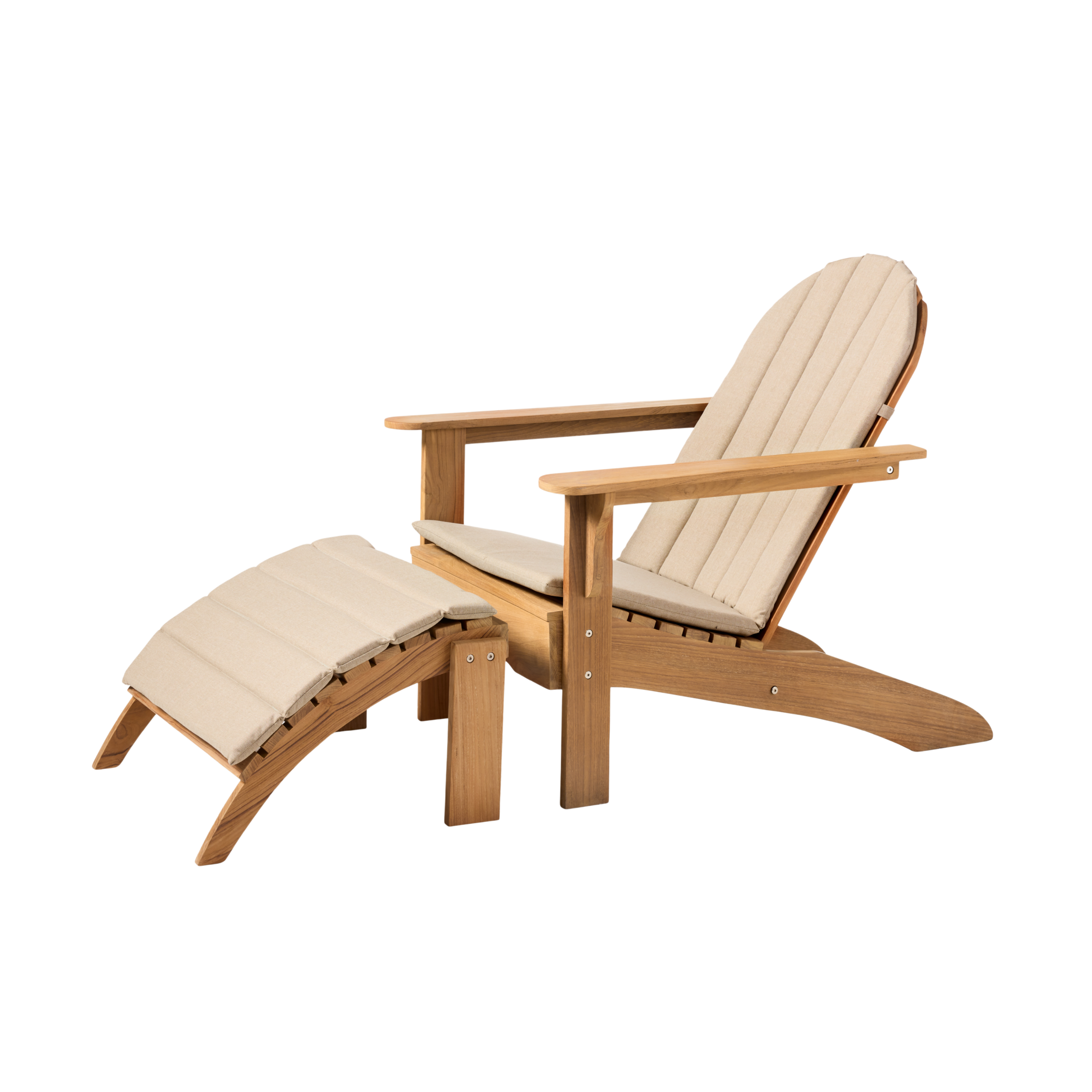 Every detail is created with calm and balance in mind – from the warm glow of the teak to the sand-coloured cushions that follow the lines of the chair and footstool.